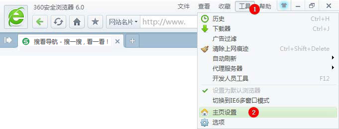 1、打开360安全浏览器,在菜单栏中点击 【工具】 - 【主页设置】