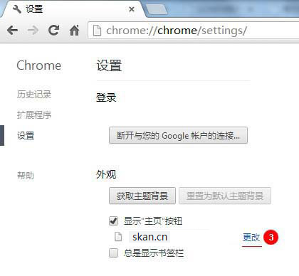 2、在页面右侧 勾选【显示主页按钮】,并点击【更改】