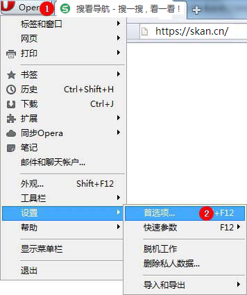 1、打开Opear浏览器,在浏览器左上方点击 【Opear】 - 【设置】 - 【首选项】