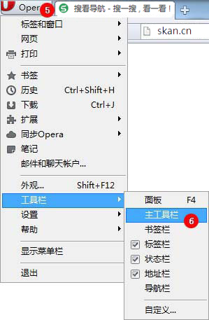 4、在浏览器左上方点击 【Opear】 - 【工具栏】 - 【主工具栏】