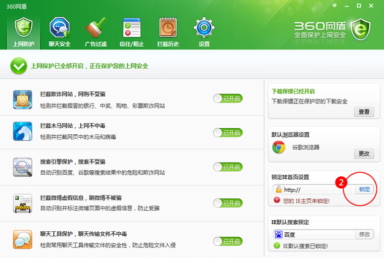 1、打开360安全卫士,点击界面右侧 【IE主页未锁定】 锁定
