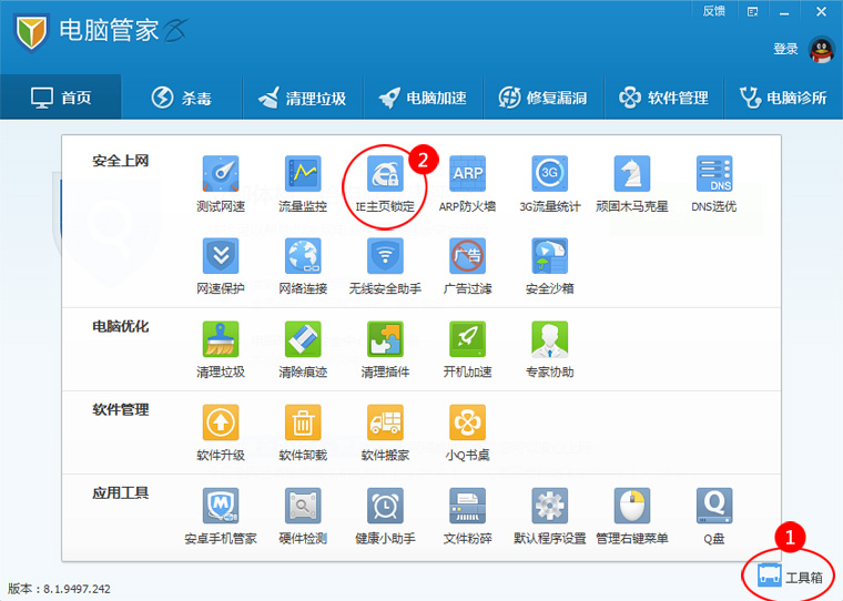1、打开QQ管家,点击界面右下方的 【工具箱】